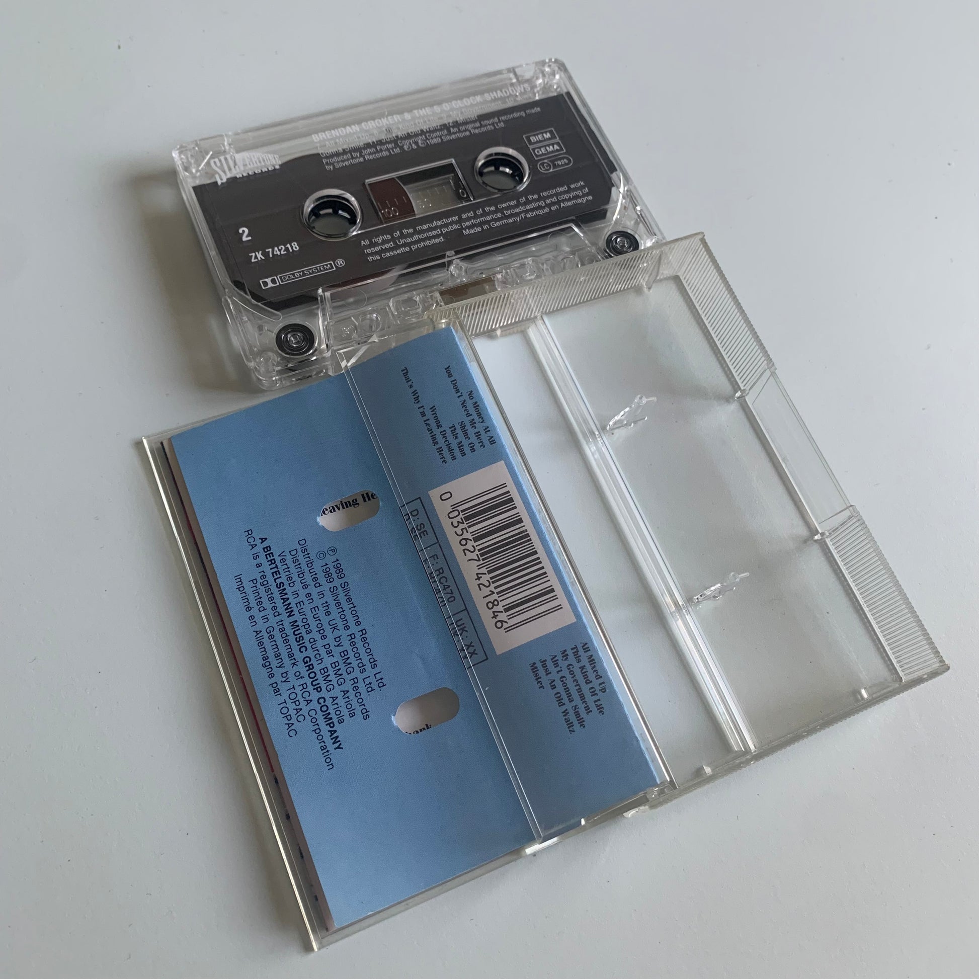 "Cassette audio de Brendan Croker And The 5 O'Clock Shadows, enregistrée en 1989. Profitez de la qualité sonore supérieure de l'époque avec ces chansons intemporelles de cet artiste britannique émérite."