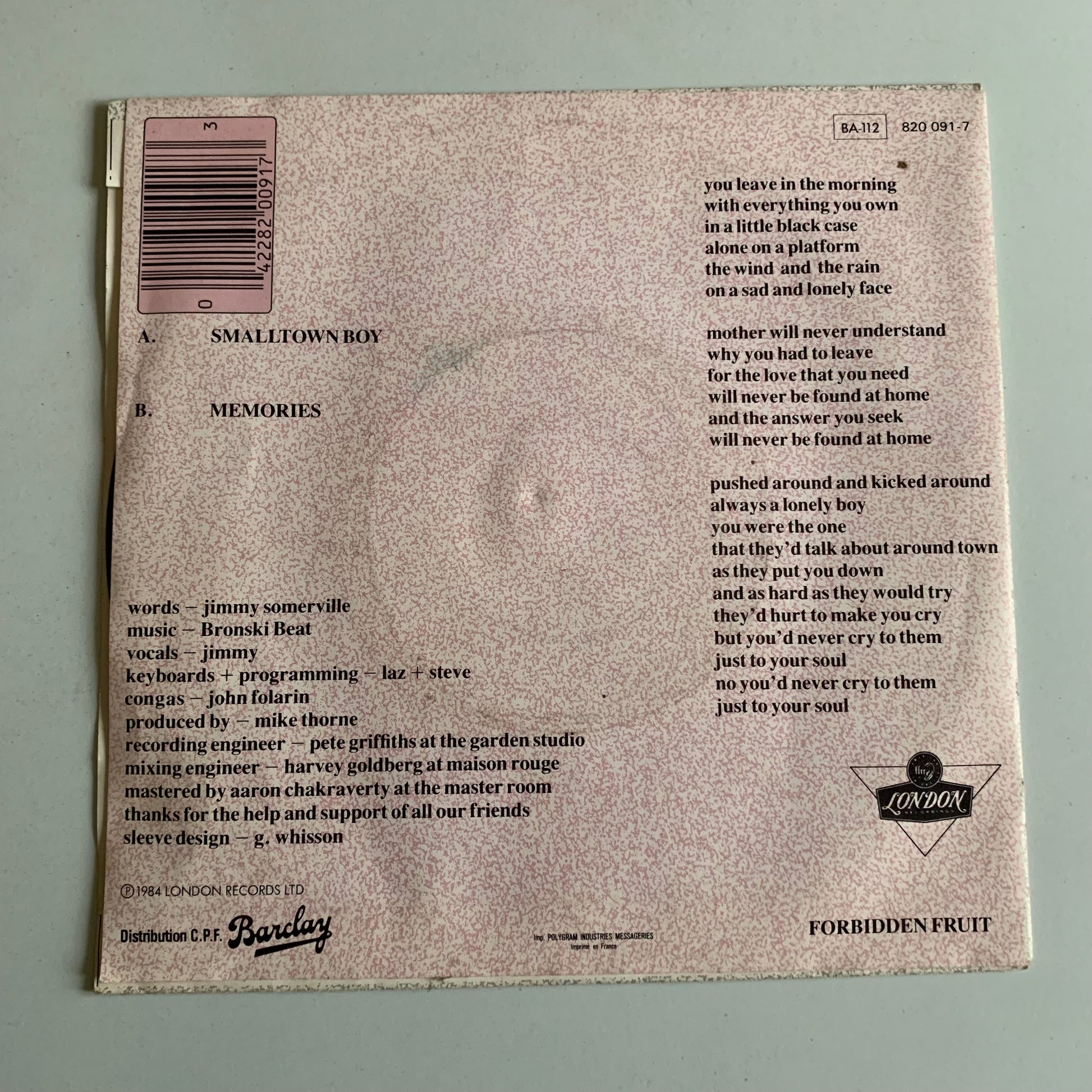 Bronski Beat - Smalltown Boy - Single 1984 Occasion