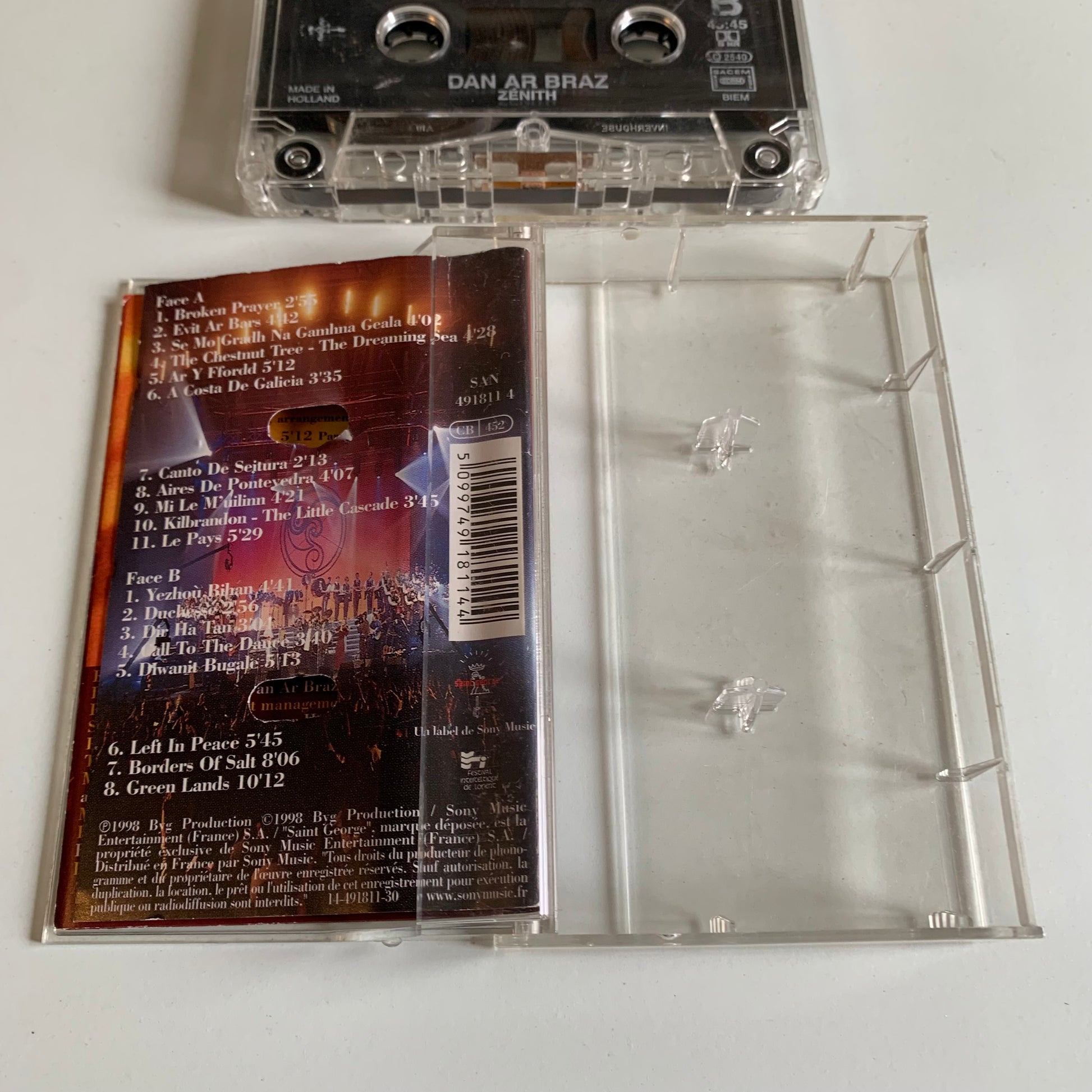 Cette cassette audio de Dan Ar Braz Et L'Héritage Des Celtes a été enregistrée lors de leur tournée au Zénith en 1998. Profitez de la musique émouvante de cet artiste talentueux et découvrez l'héritage celte à travers ses performances en direct. Un must pour les fans de musique celtique ou pour toute personne désireuse de découvrir de nouveaux sons.