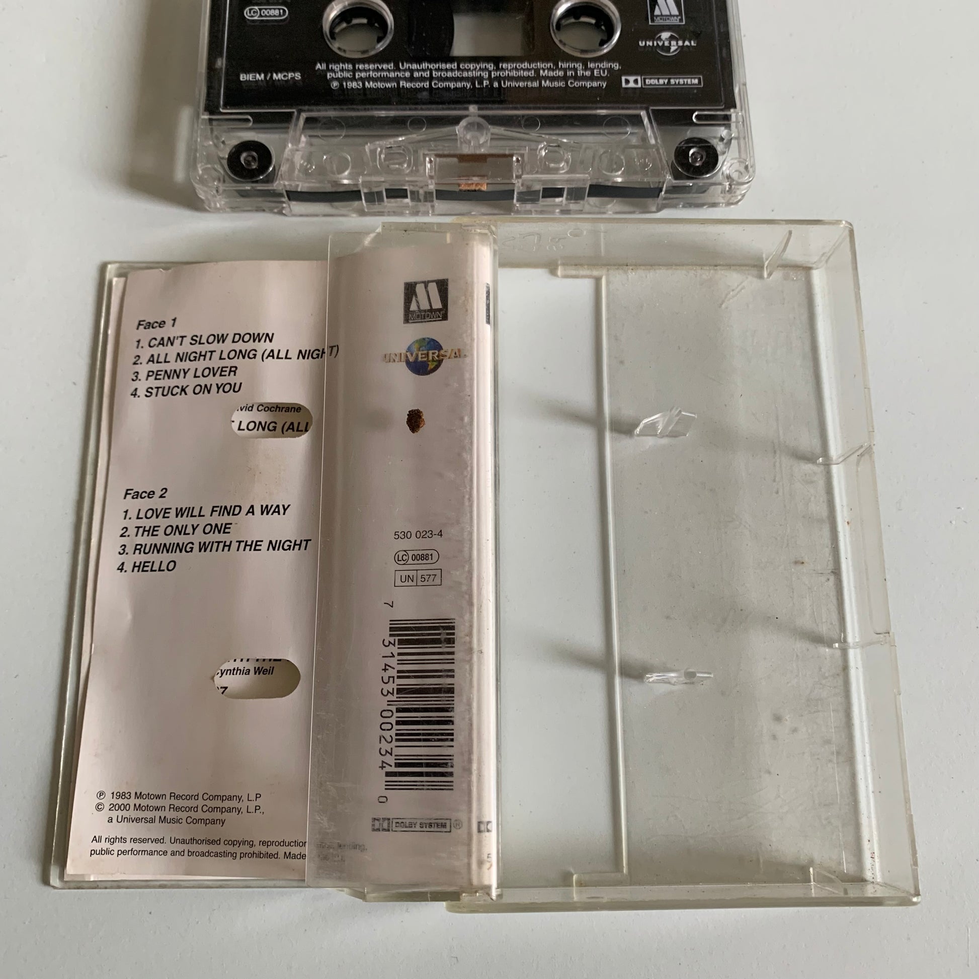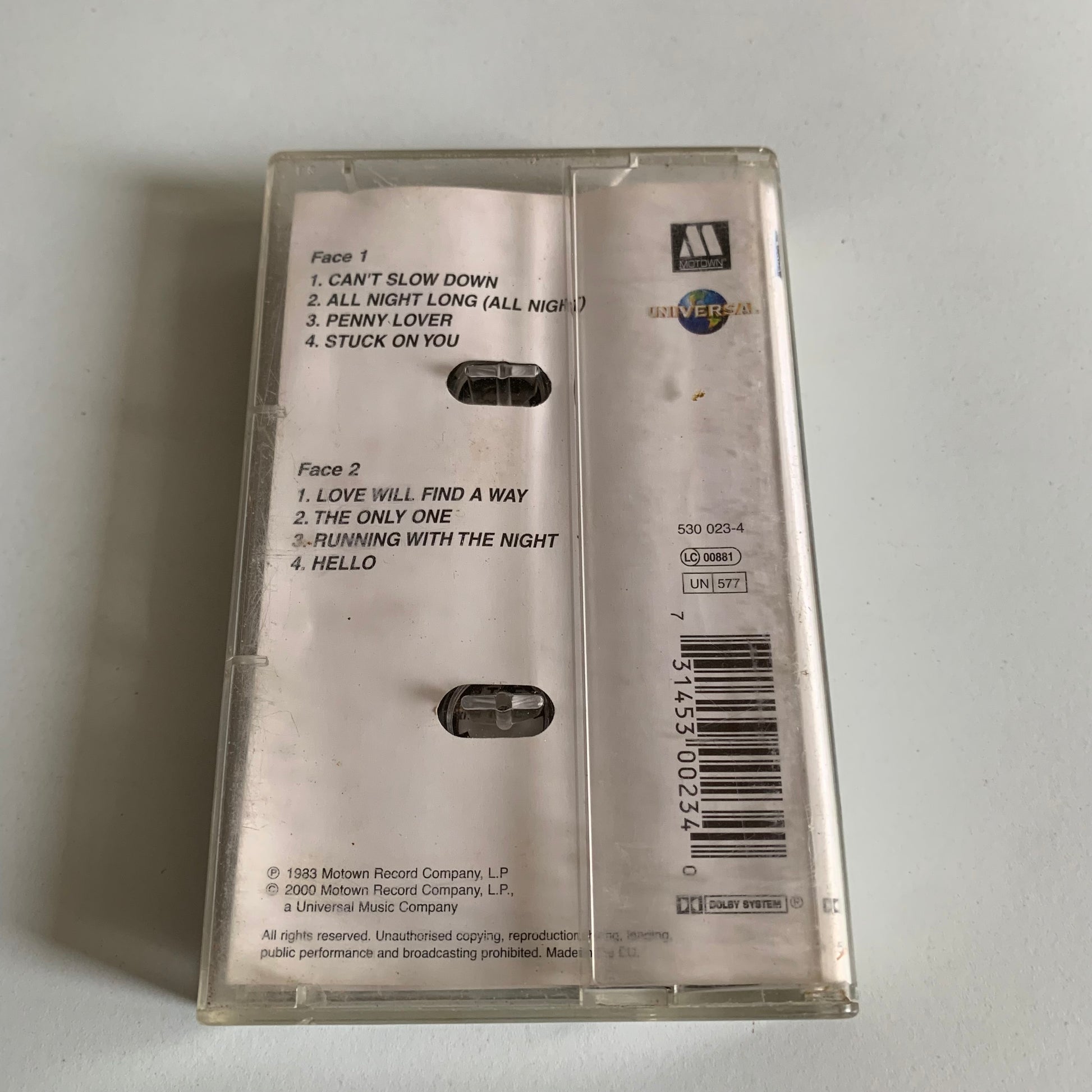 "Cassette audio de Lionel Richie pour l'occasion de "Can't Slow Down" de 1983. Écoutez les tubes classiques de Richie dans leur format d'origine. Expérimentez la nostalgie d'un temps passé avec cet objet de collection."