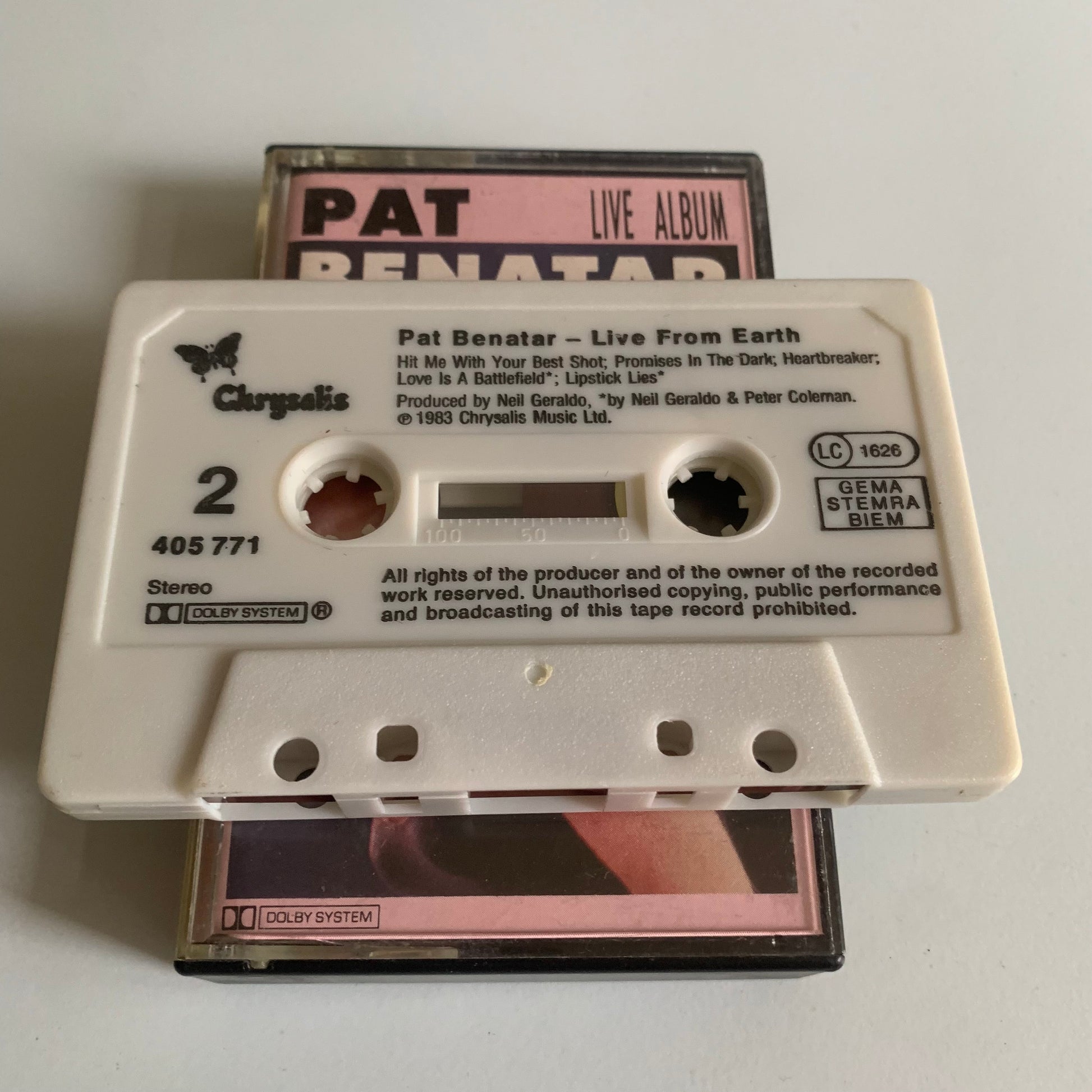 Écoutez la chanteuse rock légendaire Pat Benatar en direct avec cet enregistrement live de 1983 sur cassette audio. Profitez du son authentique et de la performance énergique de Benatar, avec ses plus grands succès comme "Hit Me with Your Best Shot". Parfait pour les fans de musique live et de rock classique.