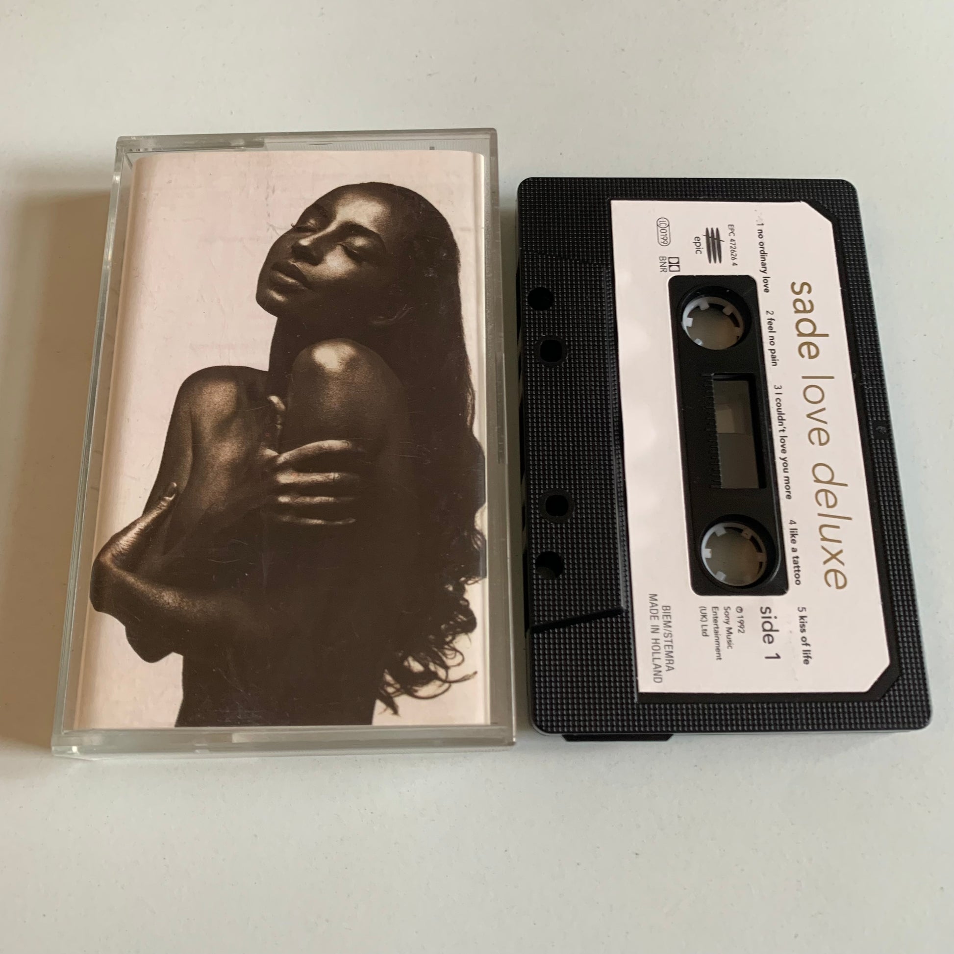 Cassette audio de l'album 1992 "Love Deluxe" de Sade. Profitez de la voix unique de l'artiste pour une expérience d'écoute inoubliable. Cassette idéale pour les audiophiles et les amoureux de musique tendances.